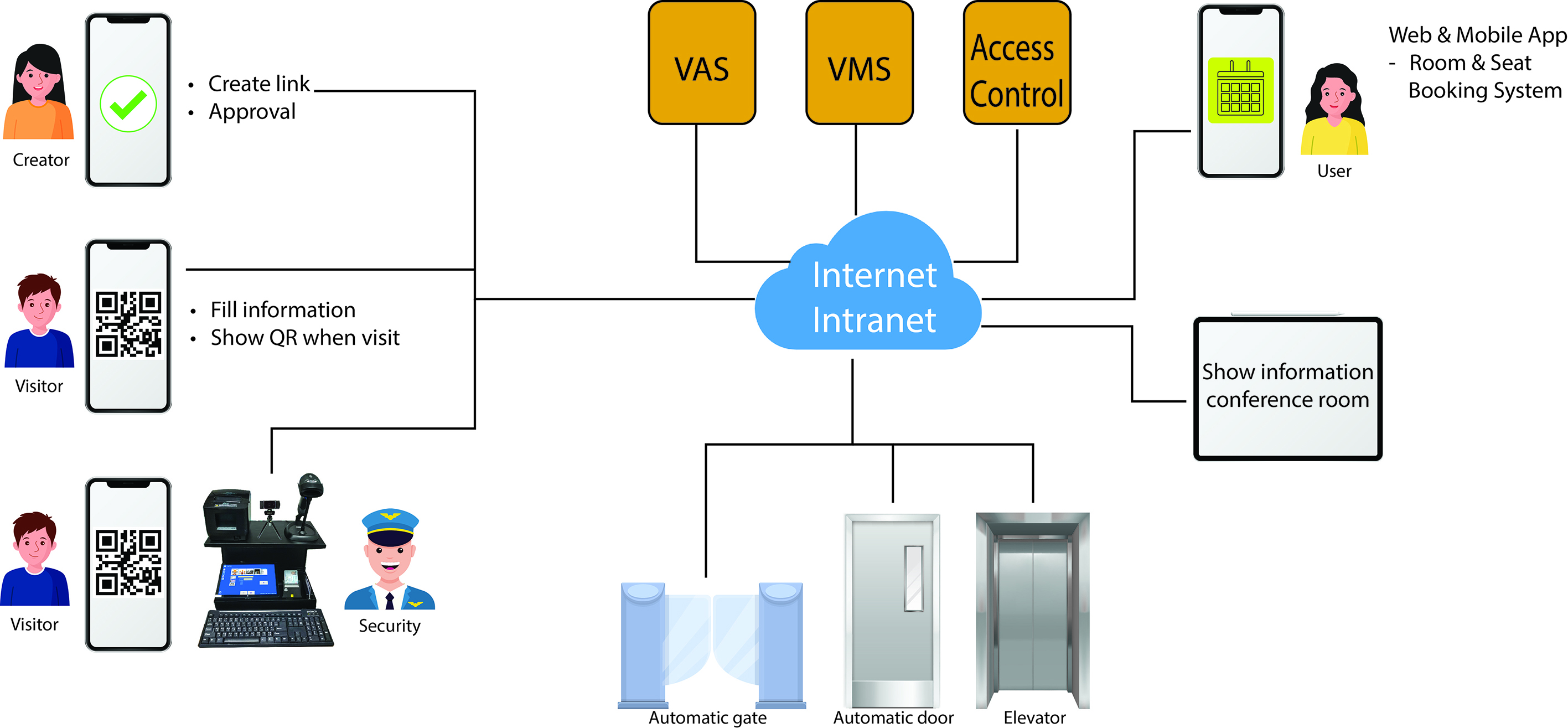 - o Access Control – ระบบสามารถเชื่อมต่อกับประตูอัตโนมัติ, ประตูกั้นเข้าออก และลิฟท์ เพื่อกำหนดช่องทางการเข้าออกให้ผู้มาติดต่อแต่ละรายได้